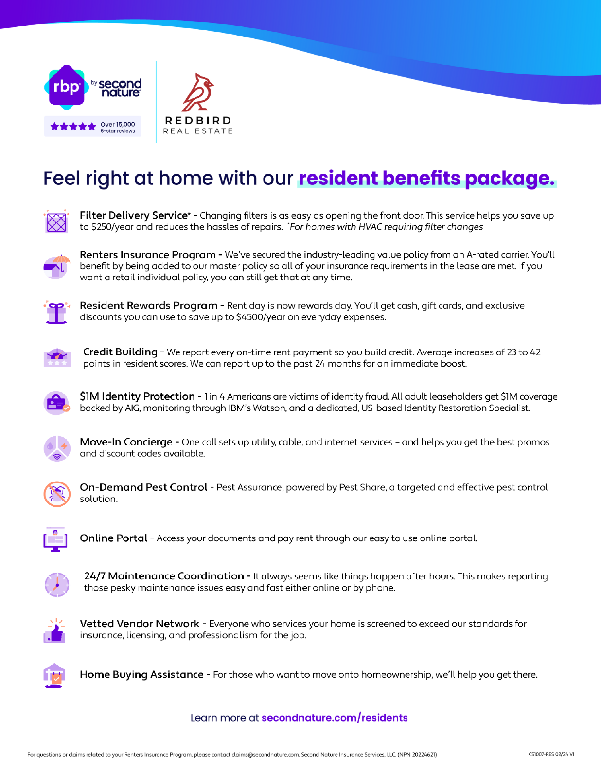 Every lease includes our Resident Benefits Package (RBP) for $65/month, which provides exceptional value and peace of mind. The RBP covers: